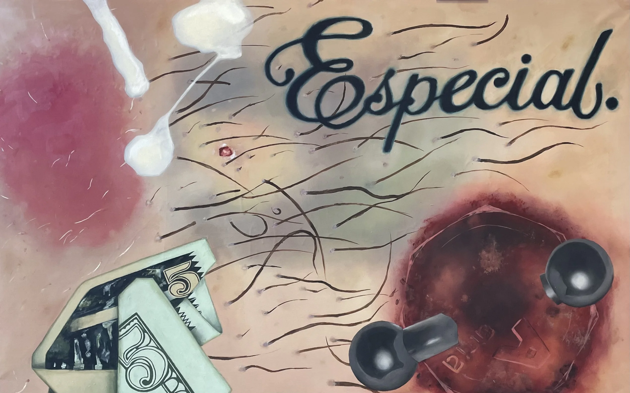 Layered images of a bruise beneath coarse leg hair, an inflamed welt, and the bottom of a cup sticky with dried wine create a dimensional base. Images are layered together, connecting to the practice of collage, to create a piece where one is unsure which parts are on the same plane. Text reading “Especial”, the tagline of Modelo’s classic beer, is rendered almost like a tattoo, in the same rich dark blue ink that I use in my diary. In the opposite corner of the canvas is an image of a $5 bill found one google, which is most certainly AI generated. Across from it, a piercing barbell that seems as if it enters the sticky dry wine glass. In the final corner, a splatter of cum from an internet porn site.