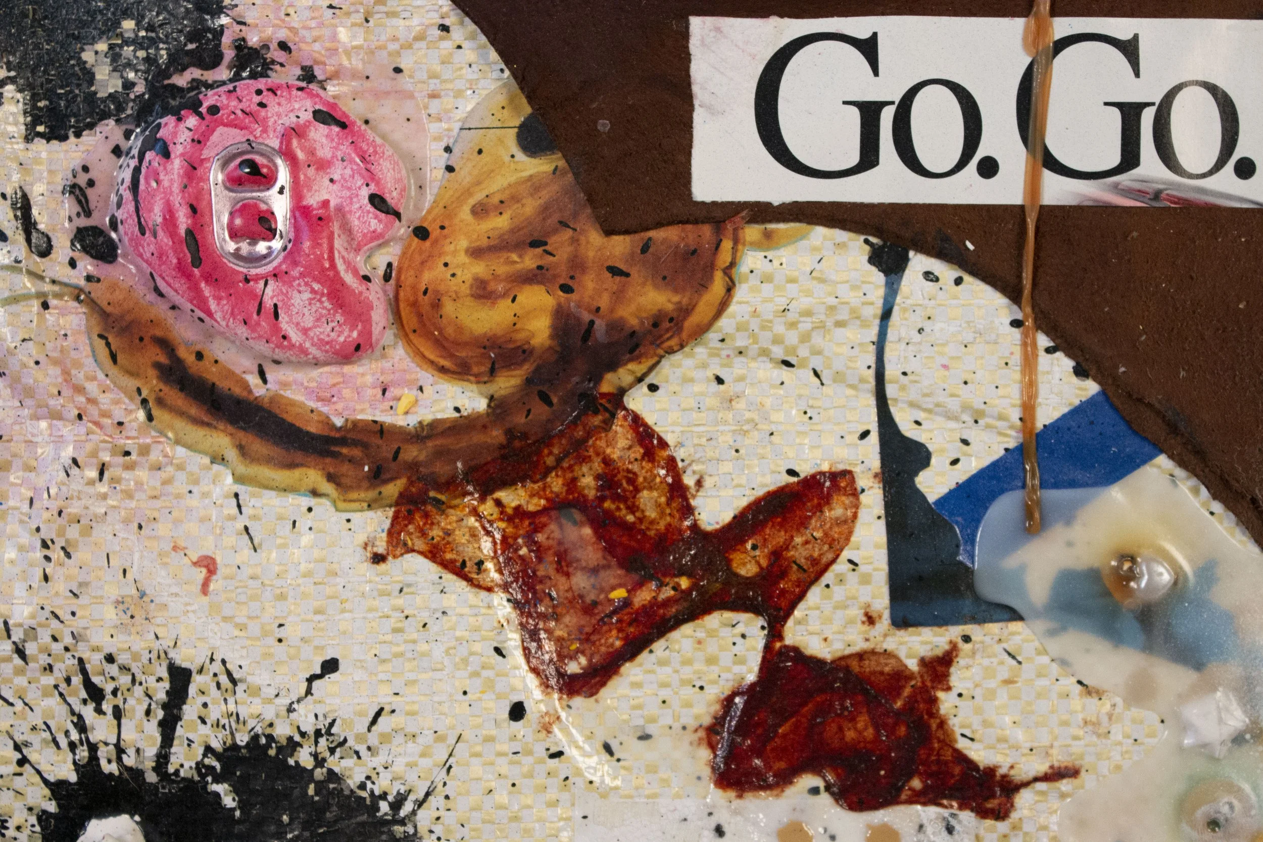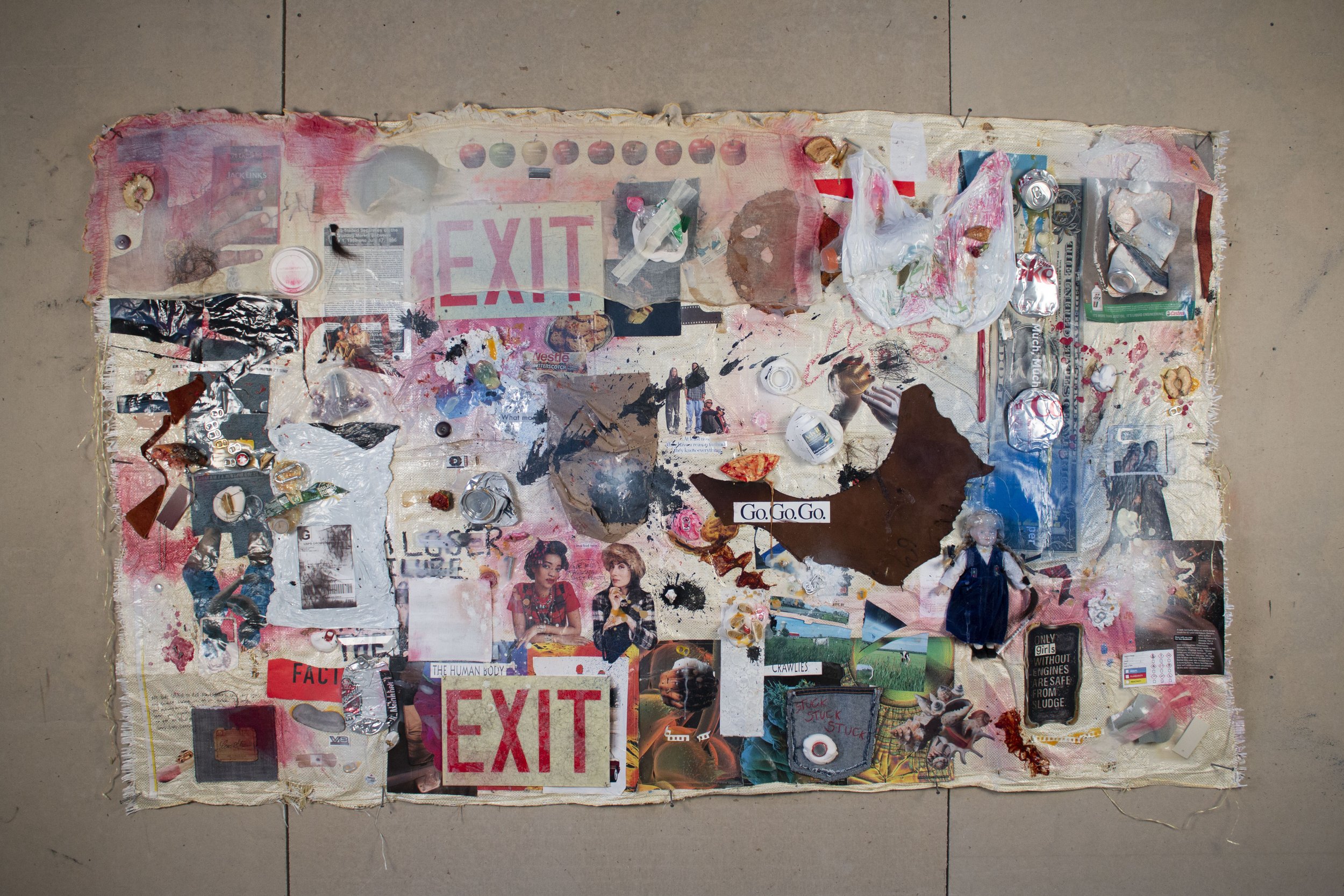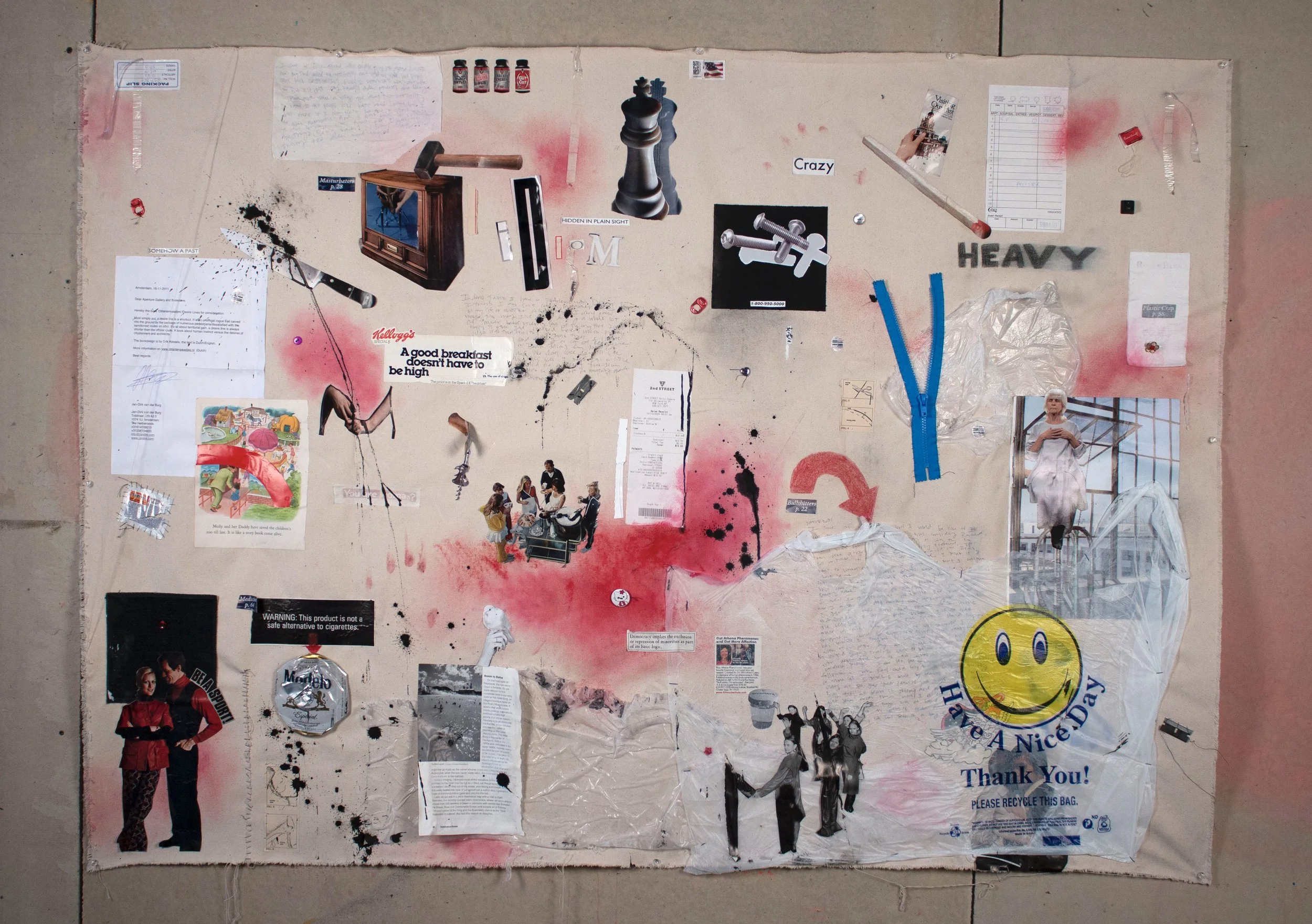 Idiom (2024) is a piece rooted in the practice of drawing, explicitly concerned with how texture and form interact to create moments of visual interest through the action of mark-making. I made the piece thinking a lot about traces of action and being in connection to physical mark. The piece contains written confessionals, found objects, a receipt, a crushed can, discarded plastic, and magazine clippings, which work together to create a disarming visual whole.