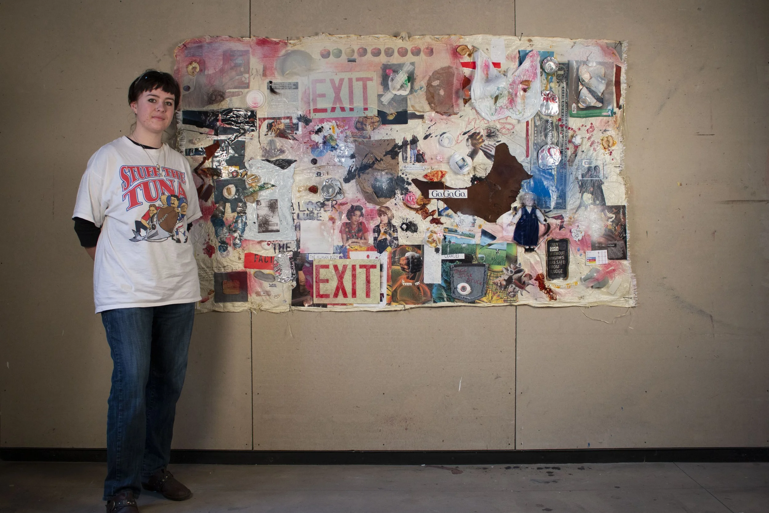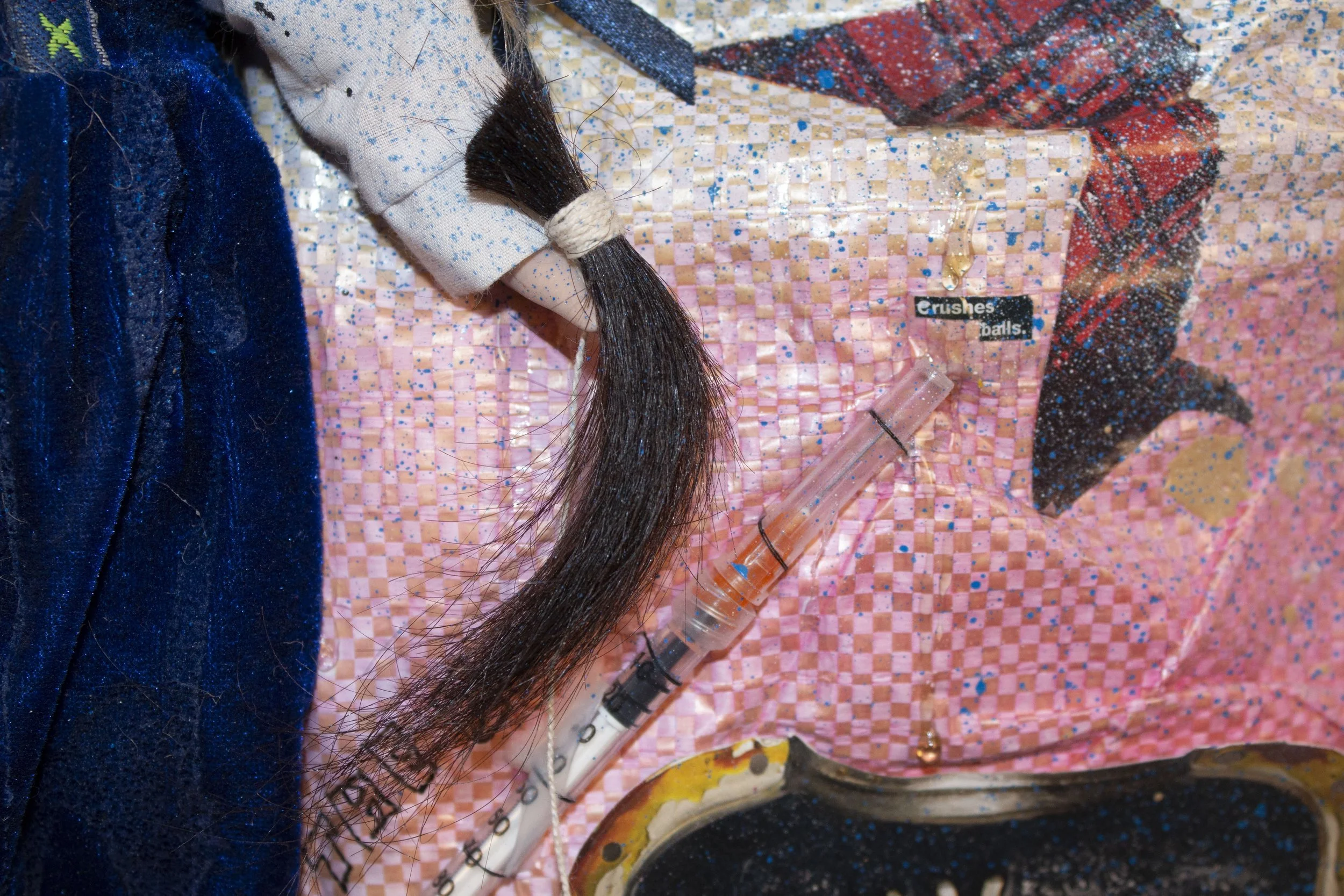 Thorough Scrubber (2024) is an experiential assemblage piece built on discarded plastic. The woven plastic casing once housed a roll of canvas, maintaining cleanliness on the inside by taking the brunt of dirt collected during shipping. Enforced with PVA and thick scratchy burlap, the substrate gained a stiff cracking texture. A variety of mediums are used in this piece, including magazines, plaster, discarded materials, oil paint, spray paint, paint sticks, pen, ink, colored pencil, crayon, melted wax wood glue, PVA glue, sewing, melted plastic wrapping, honeyed tea, SCOBY and rotting food. Discarded materials present in the piece are both found in the street and from my personal trash. They include crushed cans, soda tabs, bottle caps, razor blades, safety pins, nails, screws, an advil bottle, a bloody bandaid, a doll, exit signs, human hair, glass, nail polish, broken dishes, masking tape, receipts, leather scraps, cut up jeans, gauzy fabric, buttons, grapefruit, apple, lime, a beef jerky package, and plastic keychains. The materials were layered in various attachment styles to create a thick, chewy surface. This piece pushes a grotesque bodily sensation in the viewer, almost as if they are getting stuck to the work. Thorough Scrubber is inspired by my personal experience with OCD, and aims to confront audiences with a visual overwhelm.